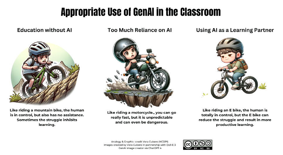 아래의 그림은 미국 노스캐롤라이나주 공공교육부서의 지침에서 지향하는 생성형 인공지능의 적용 방향을 보여준다. 이들은 생성형 인공지능을 교육의 동반자(partner)로 표현하며 자전거에 비유하는데, 먼저 생성형 인공지능을 완전히 배제한 교육은 일부 학생들에게 어떠한 지원도 없이 산악 자전거를 타는 것 같은 어려움을 초래할 수 있다. 반면, 생성형 인공지능에 지나치게 의존하는 교육은 오토바이와 같아서, 굉장히 빠르게 나아갈 수 있으나 방향을 예측하기 어렵고 때로는 위험할 수 도 있다. 마지막으로 학습의 동반자로서 생성형 인공지능의 사용은 전기자전거에 비유된다. 인간은 모든 것을 통제할 수 있으나 기술의 도움으로 수고로움을 덜고, 이전보다 더 생산적인 학습 과정을 경험할 수 있다.