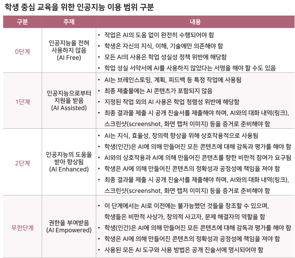 이 외에도 ‘공립학교를 위한 생성형 AI 적용의권장 및 고려 사항’은 학생들의 인공지능 이용 범위를 네 개의 영역으로 구분하여 제시한다. 이러한 내용은 생성형 인공지능을 교육 현장에 적용하는 과정에서 교육 목표, 수업 내용, 과제 규칙, 평가방법 등을 결정하는 지표로 삼을 수 있다.