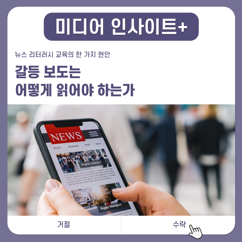 사회적 갈등 현상에는 각 집단의 주장을 표현하는 과정에서 간헐적으로 발생하는 시위, 폭력, 사회적 피해 등의 ‘사건적’ 요소가 중심이 되지만 그 밖에도 수많은 측면이 존재한다. 우선 여기에는 다양한 갈등 당사자가 관련되어 있고, 이들의 상충하는 이해관계, 사회적 파급효과, 문제점 해결방안과 같은 더 광범위한 이슈가 복잡하게 얽혀 있다. 언론은 이 요소들을 다루면서 언론 자체의 성향에 따라 일부를 생략, 강조, 재구성하기에 뉴스 이용자들이 뉴스를 통해 접하는 현실은 언론마다, 또한 실제와도 상당히 다른 모습을 띤다. 따라서 뉴스 이용자는 갈등 뉴스를 접할 때 뉴스에서 제시된 부분뿐 아니라 드러나지 않거나 축소, 왜곡된 측면들을 추정하면서 실제 사건의 전모를 재구성해보는 비판적 능력을 길러야 한다. 뉴스 리터러시 교육에서는 바로 이러한 능력을 어떻게 길러줄 것인지가 한 가지 중요한 현안으로 남아 있다.