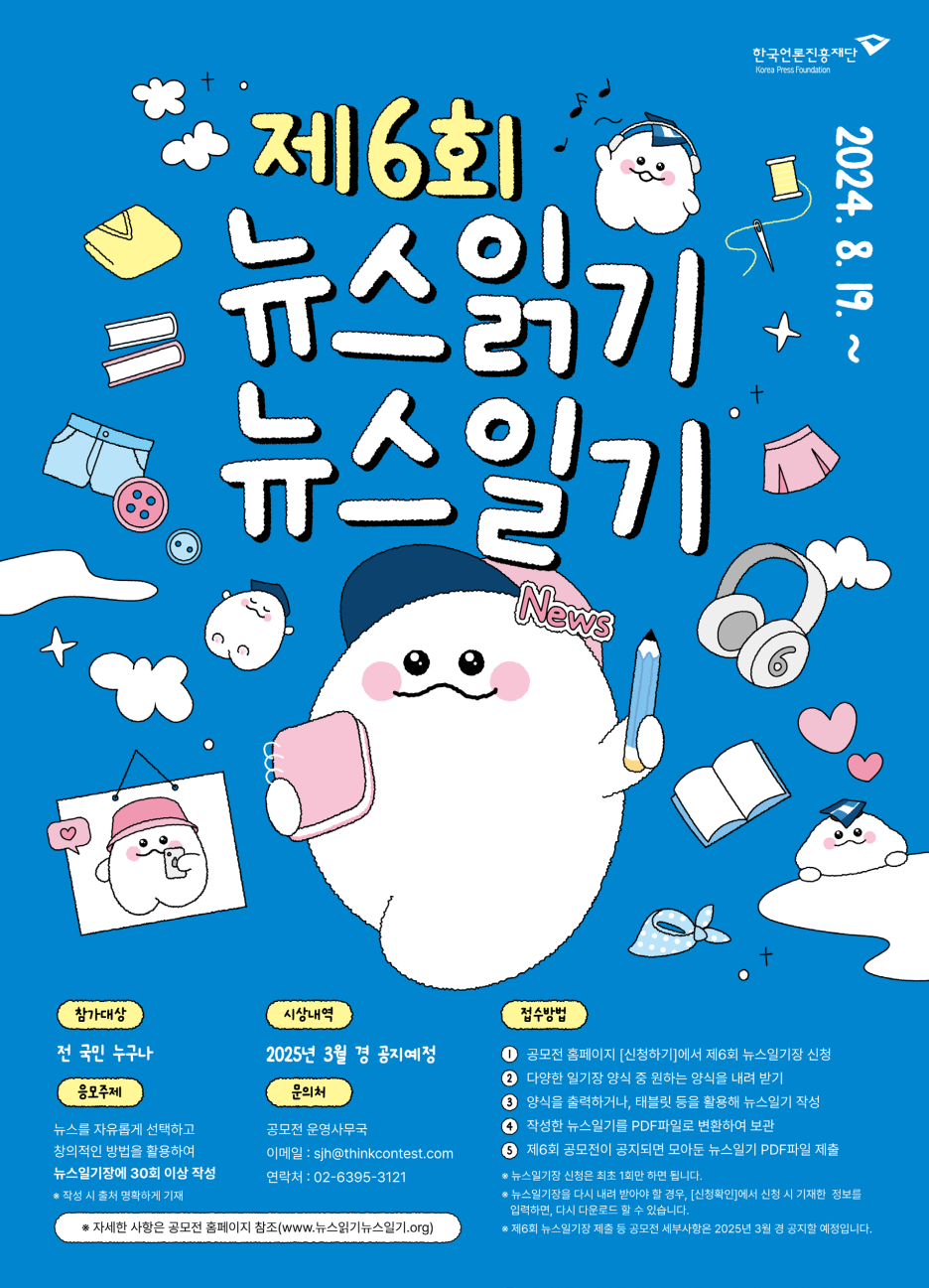 전 국민 뉴스 리터러시 캠페인인 <제6회 뉴스읽기 뉴스일기> 공모전의 일기장 제출이 3월부터 시작될 예정이다. 재단은 국민들에게 뉴스의 분별력 있는 이용과 책임 있는 활용, 올바른 뉴스 이용 습관의 중요성을 알리기 위해 24년 8월부터 뉴스 일기장을 온라인에서 배포해왔다. 정기적이고 지속적으로 30회 이상 작성(뉴스 출처 표기 필수) 된 일기장을 3월부터 6월까지 접수받는다. 시상식은 11월 열릴 예정이며, 문화체육관광부 장관상을 비롯하여 상장과 함께 총 6천여만원 상당의 상금을 수여할 예정이다. 일기장 다운로드, 제출 방법 등 자세한 내용은 ‘www.뉴스읽기뉴스일기.org’에서 확인할 수 있다.
