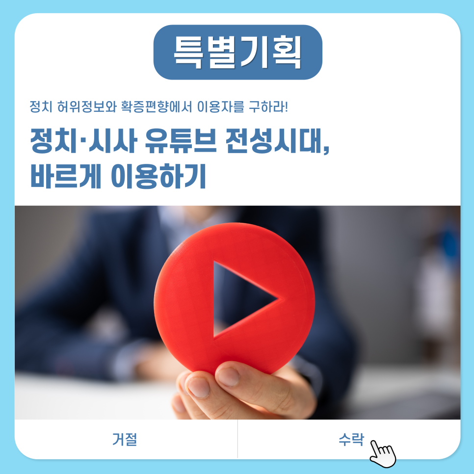 정치·시사 유튜브가 영향력을 확장해갈수록 많은 사회적 문제들이 나타나고 있다. 정파적 이용자들은 자신의 정치적 신념에 부합한 정보만을 찾고, 알고리즘에 따라 추천된 그와 유사한 정보를 지속적으로 소비하면서 ‘확증 편향’에 사로잡히기도 한다. 이들 유튜브 채널의 상당수는 상업적 이익을 극대화하기 위해 특정인에 대한 인신 공격이나 비방, 음모론 제기, 허위정보 유포, 혐오 표현을 서슴지 않는다. 이러한 유튜브 채널들은 사실상 규제를 받지 않기 때문에 문제가 개선되지 않고 있다. 여기서는 정치·시사 유튜브 전성시대에 이용자들이 이러한 현상을 어떻게 바라보아야 할지 미디어 리터러시 관점에서 살펴본다.