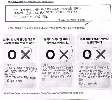 수업 사례 중 가장 최근에 진행했던 수업을 소개하자면, 미디어 생비자인 학생들이 자신의 미디어 이용 습관을 돌아보고, 정보를 비판적으로 분석하며, 이를 바탕으로 사회 참여를 실천했던 프로젝트가 떠오른다. 학생들은 여러 미디어교육 관련 사이트(SNU 팩트체크센터, 시청자미디어재단 팩트수사대, 미리네 등)를 활용해 허위조작정보를 식별하는 방법을 배우고, 수평적 읽기 방식으로 정보의 신뢰성을 평가하는 연습을 진행하였다. 또한, 뉴스 기사를 분석하며 제작자의 의도에 따라 달라지는 미디어 표현을 분석했다. 이 과정을 통해, 학생들은 디지털 미디어를 활용(카드 뉴스, 영상 뉴스 제작, 댓글 작성, 제안하는 글쓰기 등)해 사회 문제를 알리고 해결책을 제안하며 자신의 목소리를 내는 경험을 하게 되었다.