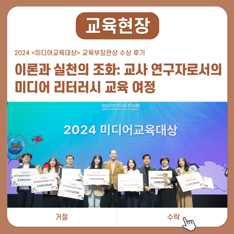 미디어 리터러시 교육은 결코 개인의 노력만으로 이루어지지 않는다. 그동안의 활동과 성과는 동료 교사들과의 협력, 학생들과의 소통, 연구자들의 조언 덕분에 가능했다. 나는 이 길에서 작은 역할을 맡았을 뿐이며, 선배들과 동료 교사들의 노력과 지혜를 통해 많은 것을 배우고 있으며, 여전히 더 배워나가고 있다. 이번 미디어교육대상을 받은 것도 함께 걸어온 분들 덕분이다. 이 자리를 빌려, 미디어 리터러시 교육의 중요성을 일깨워주신 교수님들, 항상 응원해 주신 동료 교사들, 그리고 이론을 실천으로 옮겨 보여준 학생들에게 깊은 감사의 마음을 전하고 싶다.