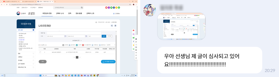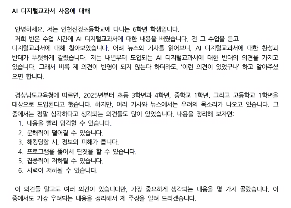 이러한 나의 문제의식을 들여다보기라도 한 듯, 한 학생은 여러 기사를 읽고 난 뒤 “왜 기사에 학생들의 목소리는 없을까요?”라며 의문을 품는 모습을 보였다. 이러한 학생의 문제의식은 직접 교육부에 자신의 의견을 제출하는 사회 참여로 이어졌다. AI 디지털 교과서에 대한 자신의 의문을 글로 담아 여러 문제점을 보완해 달라는 제안을 하며 사회 참여를 실천한 것이다. 그 학생이 자신의 글이 교육부에서 심사 중이라는 소식을 기쁘게 전하는 모습은 나에게 큰 감동으로 남았다. 아이들이 스스로 문제를 인식하고 행동으로 옮기는 과정을 지켜보며 비판적 리터러시가 실현되는 순간을 직접 목격한 기쁨의 순간이었다.