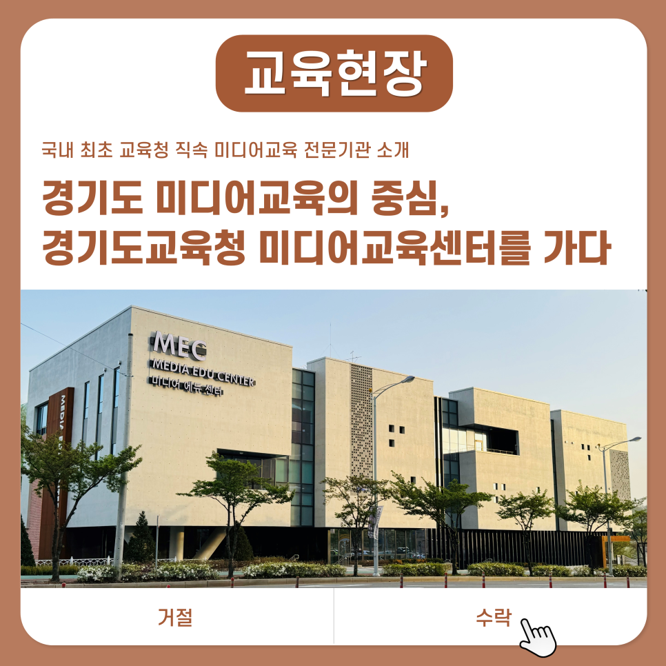 경기도교육청 미디어교육센터는 학교 미디어교육을 지원하고 디지털 사회를 이끌어갈 학생 맞춤형 미디어교육을 정착하며, 지역사회 미디어교육을 연결하는 전국 최초의 경기도교육청 직속 기관이다. “미디어로 즐겁게, 안전하게, 세상과 소통하다”라는 비전 아래, 학생들이 미디어를 창의적이고 즐겁게 활용하면서 안전하게 소비할 수 있는 능력을 기르고, 미디어를 통해 스스로를 표현하고 세상과 소통하며 자신의 꿈을 실현할 수 있도록 다양한 교육활동을 펼치고 있다.
