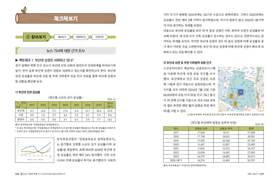 철저하게 팩트체크 계획을 세운 후, 본격적인 자료 수집을 시작했다. 먼저 비교적 쉽게 접할 수 있는 양적 자료부터 수집했다. 앞서 언급한 바와 같이 자료의 신뢰성을 위해 공공기관이 공개한 자료들 위주로 수집했고, 출처 또한 정확하게 기재했다. 그 결과, 한국부동산원에서 공실률 및 임대료, 부산교통공사에서 부산대역 유동 인구, 한국은행에서 기준금리 및 가계대출 금리, 통계청에서 소비자 물가를 조사했다. 그리고 수치 자료를 수집할 때는 조사 기간, 조사 대상, 조사 방법을 면밀히 검토했으며, 팩트체크 과정에서 현상의 추세를 파악하기 위해 가능한 한 최근 5년 이상의 데이터를 수집했다.