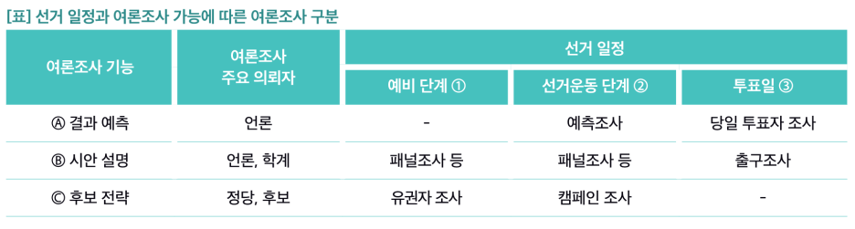 주요 선거를 앞두고 수행하는 선거 여론조사만 해도, [표]와 같이 조사 기능과 내용에 따라 구분해 볼 수 있다. 먼저 여론조사의 목적에 주목해서 보면, (A) ‘누가 결국 이길지’ 예측하기 위해 수행하는 조사가 있고, (B) ‘이런 결과가 왜 발생했는지’ 설명하기 위해 자료를 수집하는 조사가 있다. 또는 (C) ‘어떤 사안을 제시해야 우리 당 또는 후보가 유리한지’와 같은 전략적 결정을 내리기 위해 자료를 수집하는 조사도 있다. 이렇게 다른 목적으로 수행하는 여론조사들은 흔히 조사 의뢰인(clients)도 다르고 조사하는 시점도 달라진다.