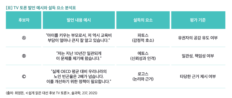 후보자 평가에 있어 보다 체계적인 기준을 갖추는 것도 유익하다. 아리스토텔레스가 제시한 설득의 3요소인 에토스(신뢰성과 인격), 파토스(감정적 호소), 로고스(논리와 근거)는 오늘날 TV 토론 평가에도 유용하게 활용할 수 있다. 예컨대, 한 후보의 발언에서 얼마나 일관성과 책임감 있는 자세를 유지하는가(에토스), 유권자의 정서에 공감하며 설득하려는가(파토스), 정책 주장에 논리적 구조와 근거가 갖춰져 있는가(로고스) 등을 기준 삼아 분석할 수 있다. 이 세 가지 기준을 바탕으로 평가하면, 단순한 호불호나 정파적 태도를 넘어선 합리적이고 균형 잡힌 판단이 가능해진다. [표]는 후보자들의 발언을 설득의 3요소(에토스, 파토스, 로고스)에 따라 분류한 예시이다.