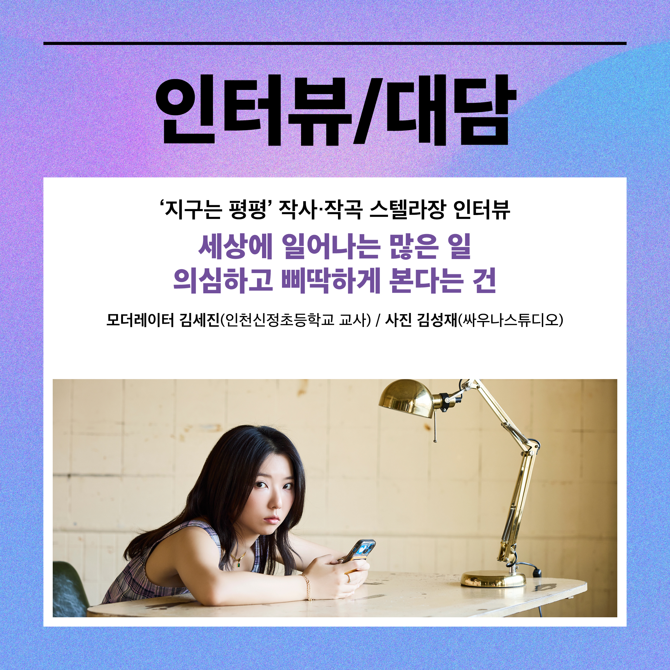 안녕하세요, 오늘 이렇게 귀한 시간 내주셔서 정말 감사합니다. 스텔라장님의 음악은 많은 사람들에게 위로와 영감을 전해주고 있는데요, 저를 비롯한 《미디어 리터러시》 독자들에게도 큰 울림을 주고 있습니다. 오늘은 그중에서도 ‘지구는 평평’이라는 곡을 중심으로, 창작자로서 음악을 통해 전하고자 하신 생각과 메시지에 대해 좀 더 깊이 이야기 나눠보려 합니다. 이 곡은 제가 수업 시간에 아이들과 함께 듣고 이야기 나누며 더 큰 감동을 느낄 수 있었는데요, 오늘은 아이들의 반응과 질문도 함께 나누며 대화를 시작해 보겠습니다.