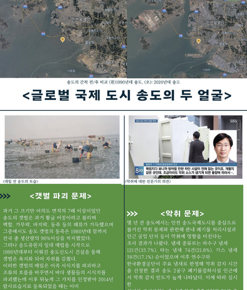 A 모둠은 먼저 기존 미디어가 송도 신도시의 긍정적 모습만 재현하고 있으나, 송도 신도시에는 갯벌 파괴와 악취 문제 등의 “신도시가 강조하는 글로벌 도시의 이미지와는 괴리가 있는 현실적 문제가 발생하고 있다”고 밝혔다. 이는 ‘글로벌 도시’와 같은 긍정적 모습만 선택하고, 환경 문제는 배제하고 있는 기존 미디어가 진실된 재현을 하지 못하고 있음을 지적하는 것이다.