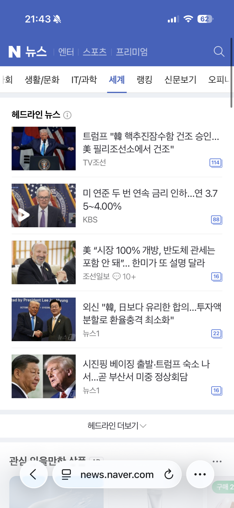 네이버 뉴스는 한 눈에 많은 주제와 기사를 볼 수 있어서 좋은데요.
