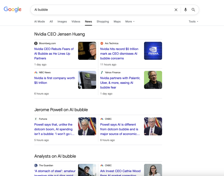 가장 최근에는 AI bubble이라는 주제에 대해 더 알아보기 위해 추가적으로 검색하고 기사들을 읽어봤어요.