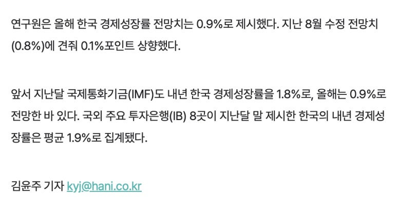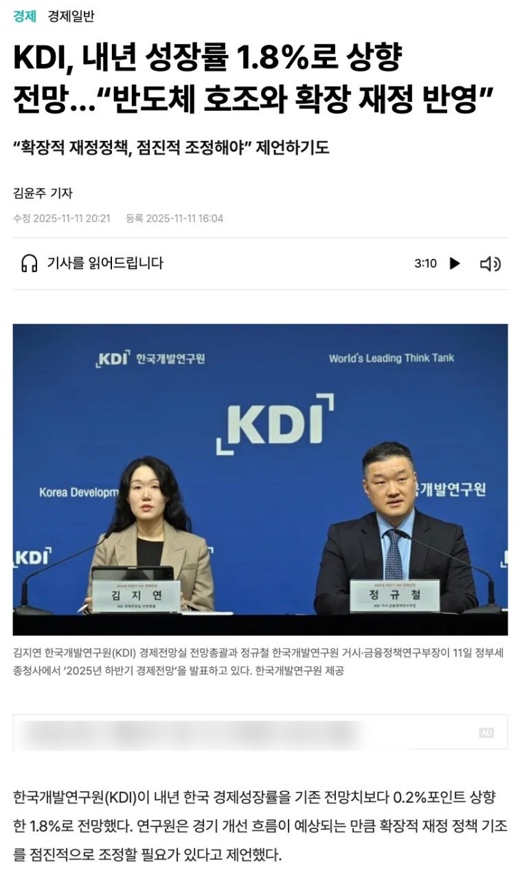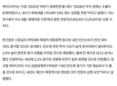 한겨레의 'KDI, 내년 성장률 1.8%로 상향 전망…“반도체 호조와 확장 재정 반영”2' 기사예요.