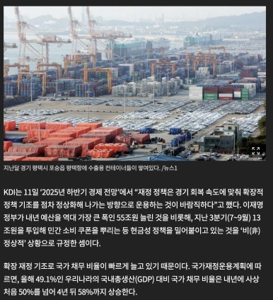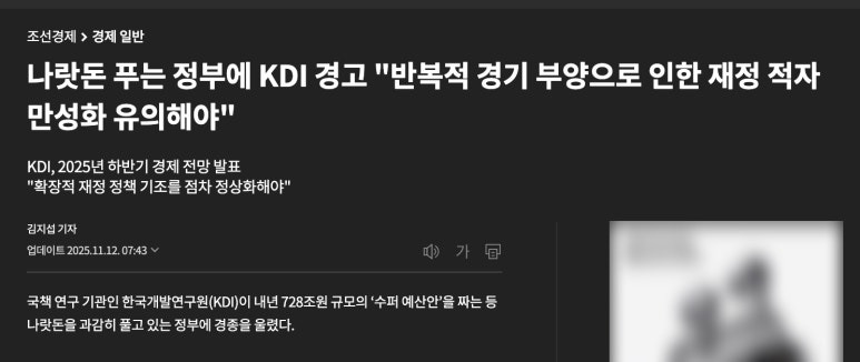 나랏돈 푸는 정부에 KDI 경고 반복적 경기 부양으로 인한 재정 적자 만성화 유의해야 KDI, 2025년 하반기 경제 전망 발표 확장적 재정 정책 기조를 점차 정상화해야