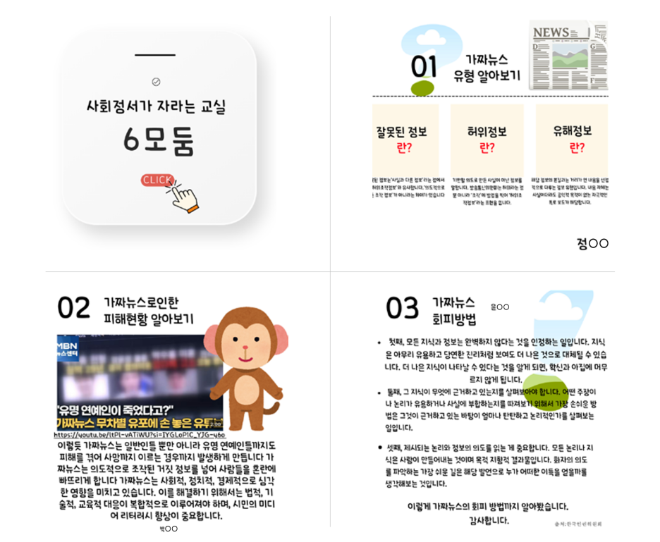 따라서 모둠별로 다양한 주제(네티켓, 미디어 중독, 팩트체크 등)로 AI의 도움을 받아 카드뉴스 시나리오를 짜고 캔바(Canva)를 활용한 카드뉴스 제작 시간을 2차시에 걸쳐 제공하였다. 카드뉴스를 만드는 것에서 끝나는 것이 아니라 모둠별로 자신들이 만든 카드뉴스를 발표하는 시간도 가졌다. 어떤 부분에서 AI의 도움을 받았는지를 언급하고 사용한 소감을 나누는 기회였다.