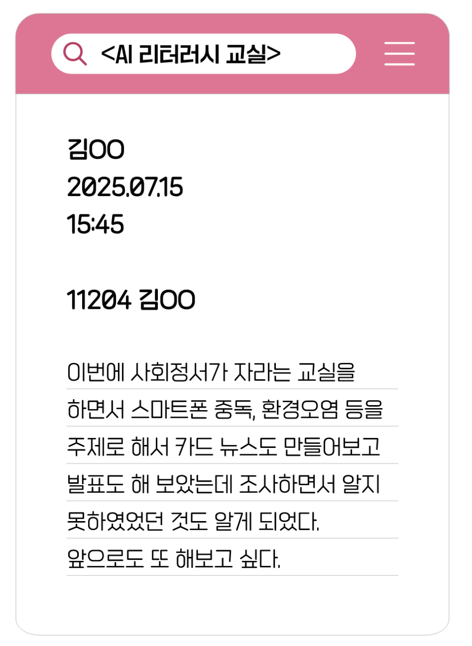 <AI 리터러시 교실> 프로그램은 무엇보다 교사인 나 자신의 교육적 관점이 크게 변화하는 계기가 되었다. 이전까지는 AI를 단순한 활용 도구로 바라보았다. 하지만 프로그램을 운영하는 과정을 통해 AI가 그저 삶을 편리하게 만드는 수단에 머무는 것이 아니라 교육적 대상으로서 함께 사유할 대상이라는 점을 깨닫게 되었다.