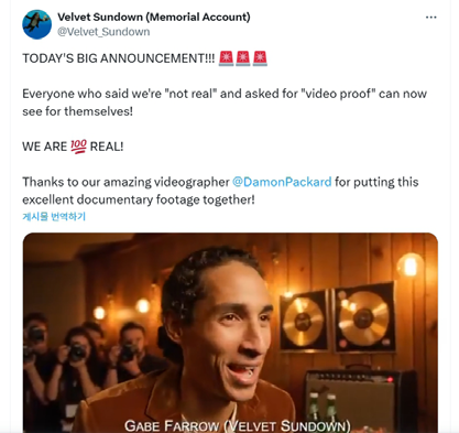 벨벳 선다운은 인스타그램 계정을 개설하고 여느 아티스트처럼 활동하는 듯 보였지만, 실존하지 않는 것 같다는 의심을 받았다. 밴드는 이런 의혹에 X에 “AI는 절대 사용하지 않는다”며 “우리는 100% 리얼”이라고 영상을 공개했다. 영상에는 밴드의 보컬 게이브 패로가 음악 관계자들과 만나고 이야기하는 장면이 담겼다.
